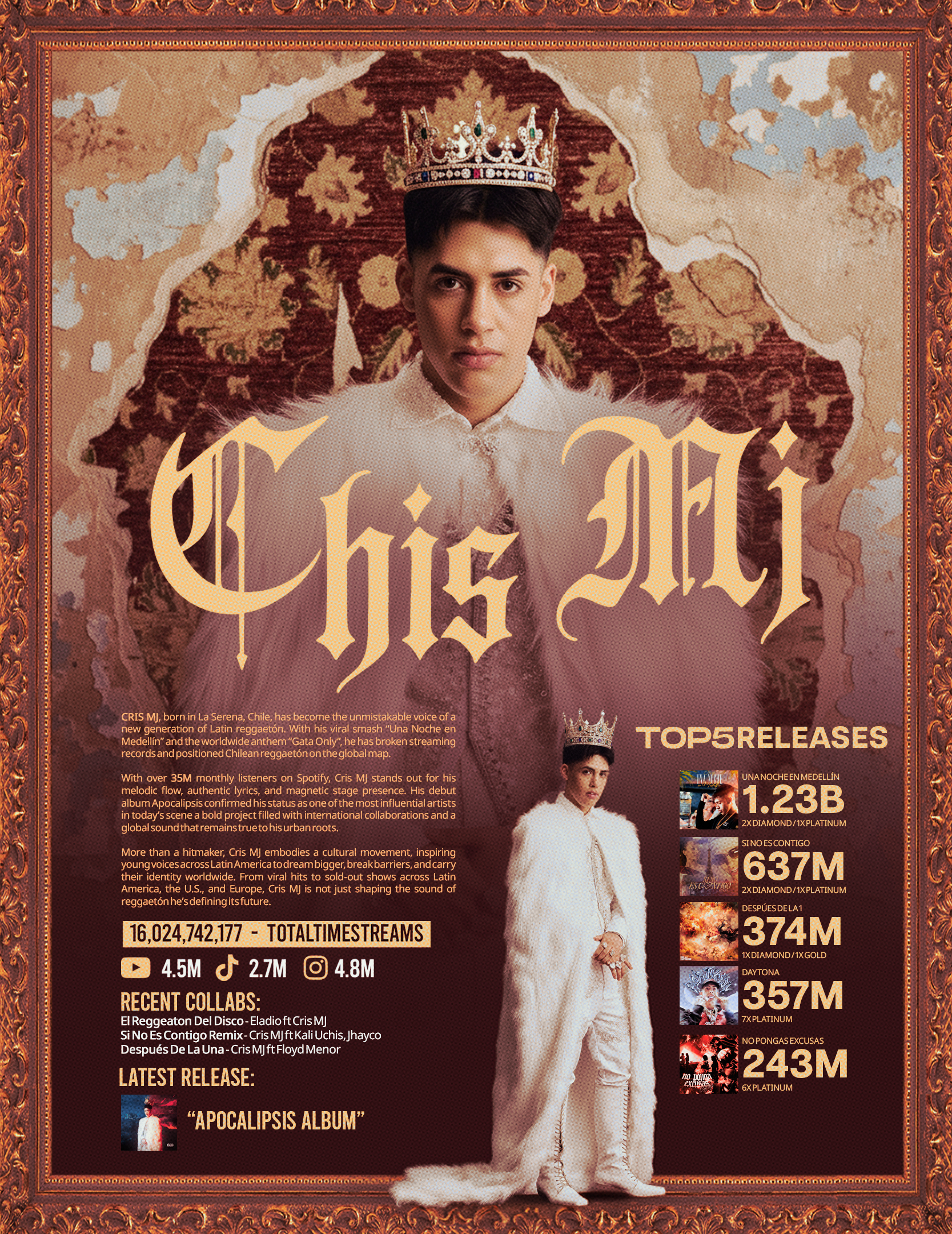 En el competitivo panorama global, la marca personal de un artista debe ser tan distintiva como su música. Nuestro desafío fue destilar la identidad sonora, el estilo y la trayectoria de Cris MJ en un sistema visual profesional y cohesivo que lo posicionara para su expansión internacional.